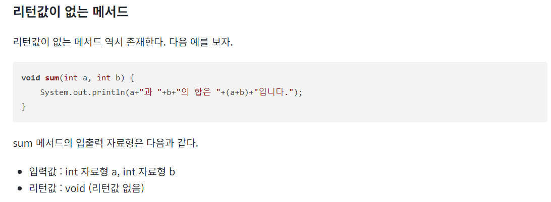 리턴자료형 메서드명(입력자료형1 매개변수1, 입력자료형2 매개변수2, ...) {